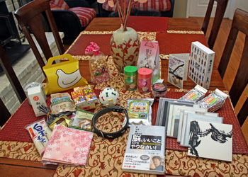 ギグルママさんからは、昔なつかしのお菓子や、伊豆の河津桜(大腸ガン治療中のご主人さまと一緒にお出かけになったそうです)をモチーフにしたお土産のハンカチ、Kayさんからは本、CD、お笑いのDVD(免疫アップにはコレに限る!)、お茶などなど、ほかにもたくさん...。